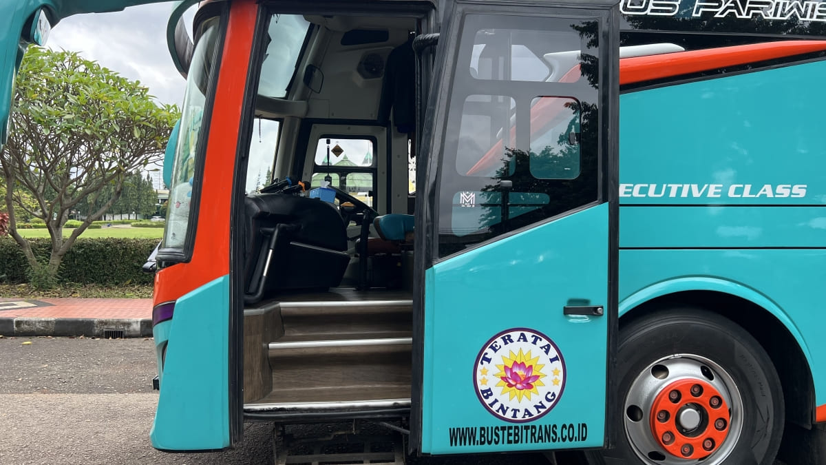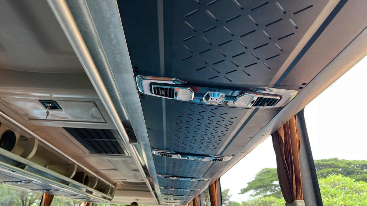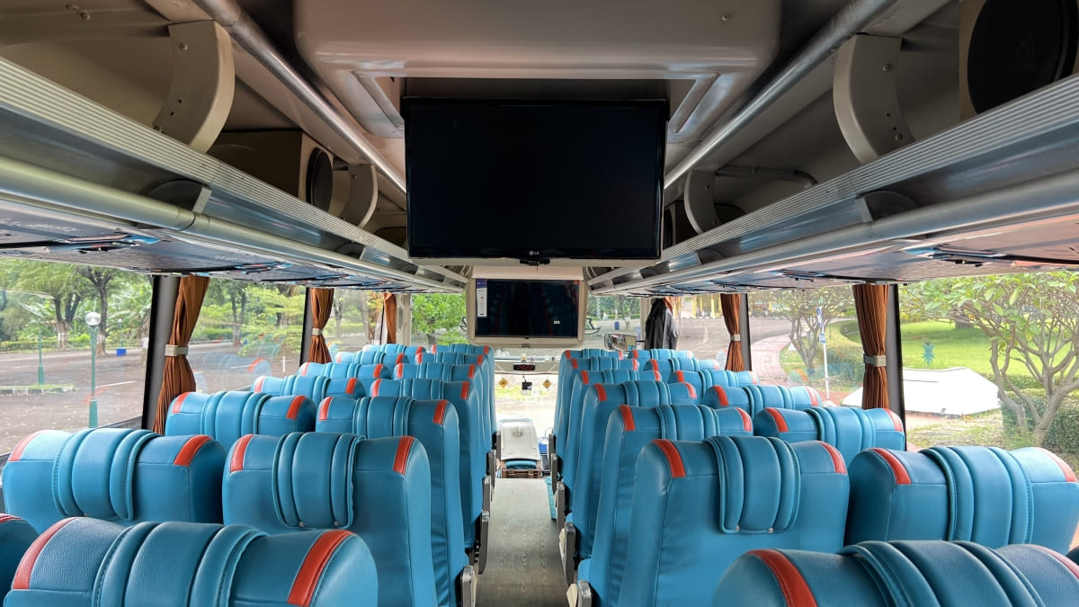 Hiburan & Koneksi: LED TV dan Karaoke Set untuk menemani keceriaan rombongan, serta slot USB Charger di tiap baris kursi agar gadget Anda tetap on terus.