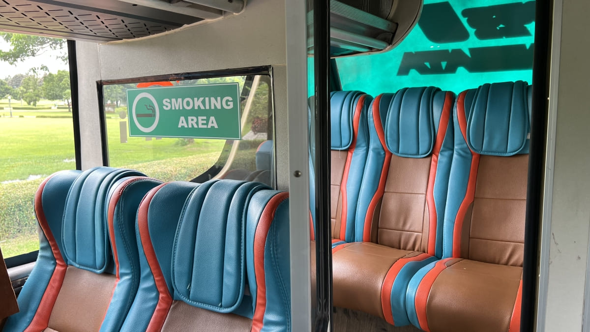 Area Khusus: Tersedia Smoking Room (Ruang Merokok) yang kedap dan terpisah di bagian belakang, sehingga penumpang yang ingin merokok tetap bisa merasa nyaman tanpa mengganggu kenyamanan udara di kabin utama.
