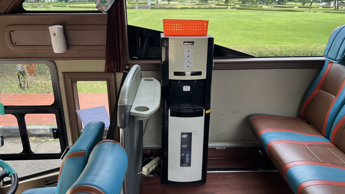 Fasilitas Spesial: Tersedia Dispenser air mineral buat Anda yang mau seduh kopi hangat atau butuh minum dingin tanpa harus menunggu bus berhenti di minimarket.