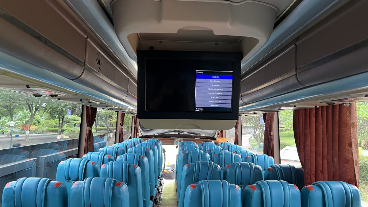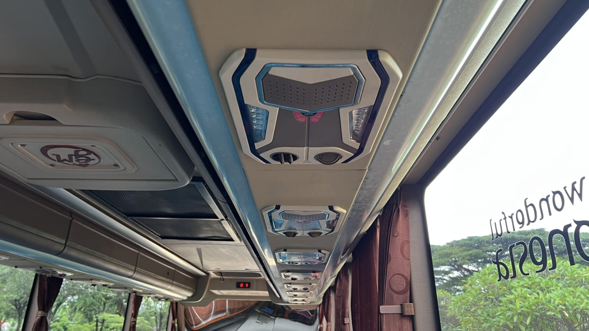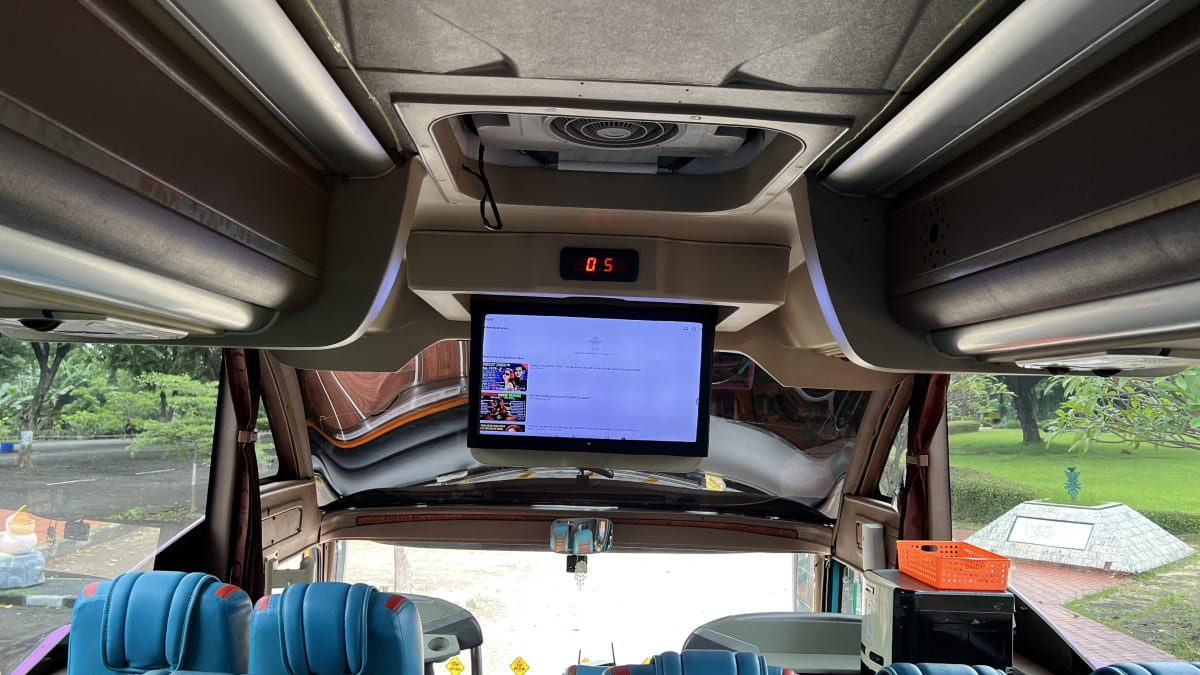 Hiburan Terus: Biar suasana pecah, ada LED TV dan Karaoke Set. Jangan takut HP mati gaya, karena ada USB Charger di setiap baris kursi.