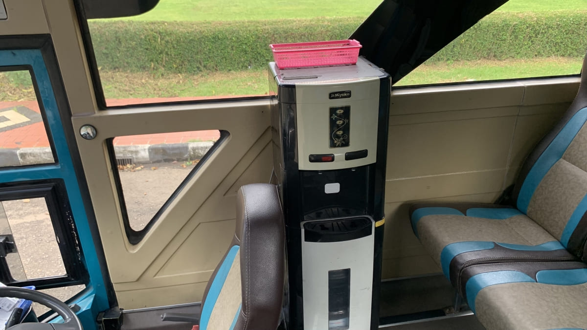 Fasilitas Spesial: Tersedia Dispenser air mineral di dalam bus. Mau seduh kopi hangat atau sekadar minum air dingin? Semua bisa dilakukan tanpa harus menunggu bus berhenti.