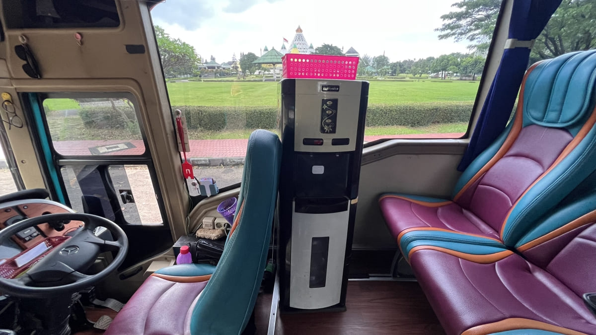 Fasilitas Spesial: Tersedia Dispenser air mineral di dalam bus. Mau seduh kopi hangat atau sekadar minum air dingin? Semua bisa dilakukan tanpa harus menunggu bus berhenti.